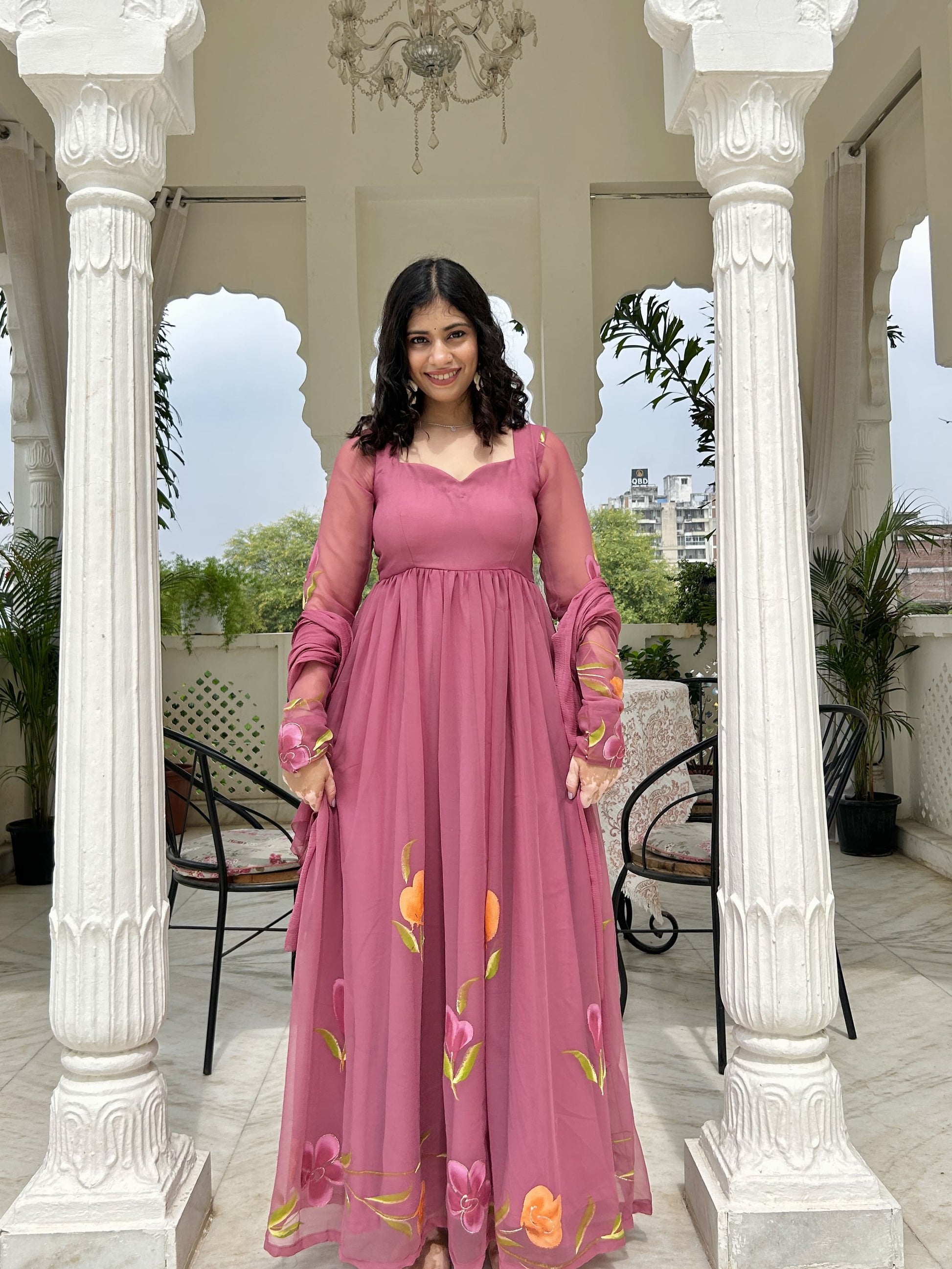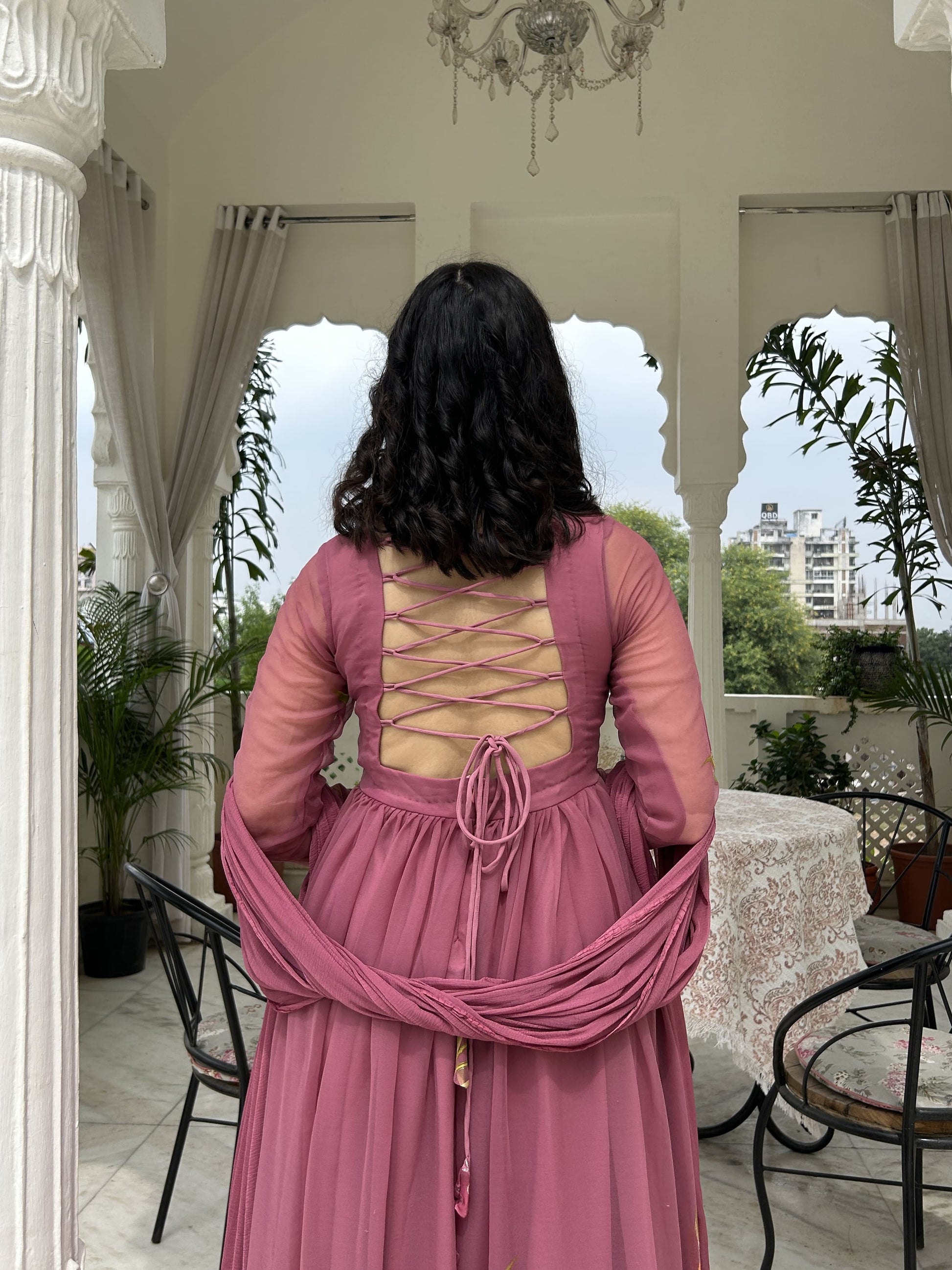 A beautifully crafted mulberry pink suit set in premium georgette with elegant rubber print detailing. The kurta features a padded, lined bodice with a sweetheart neckline and a graceful gather-flared silhouette. Designed with full sleeves, a crisscross tie-up back, and a concealed zip for an adjustable fit. Paired with glazed cotton scalloped pants and a soft chiffon dupatta for a refined festive look.