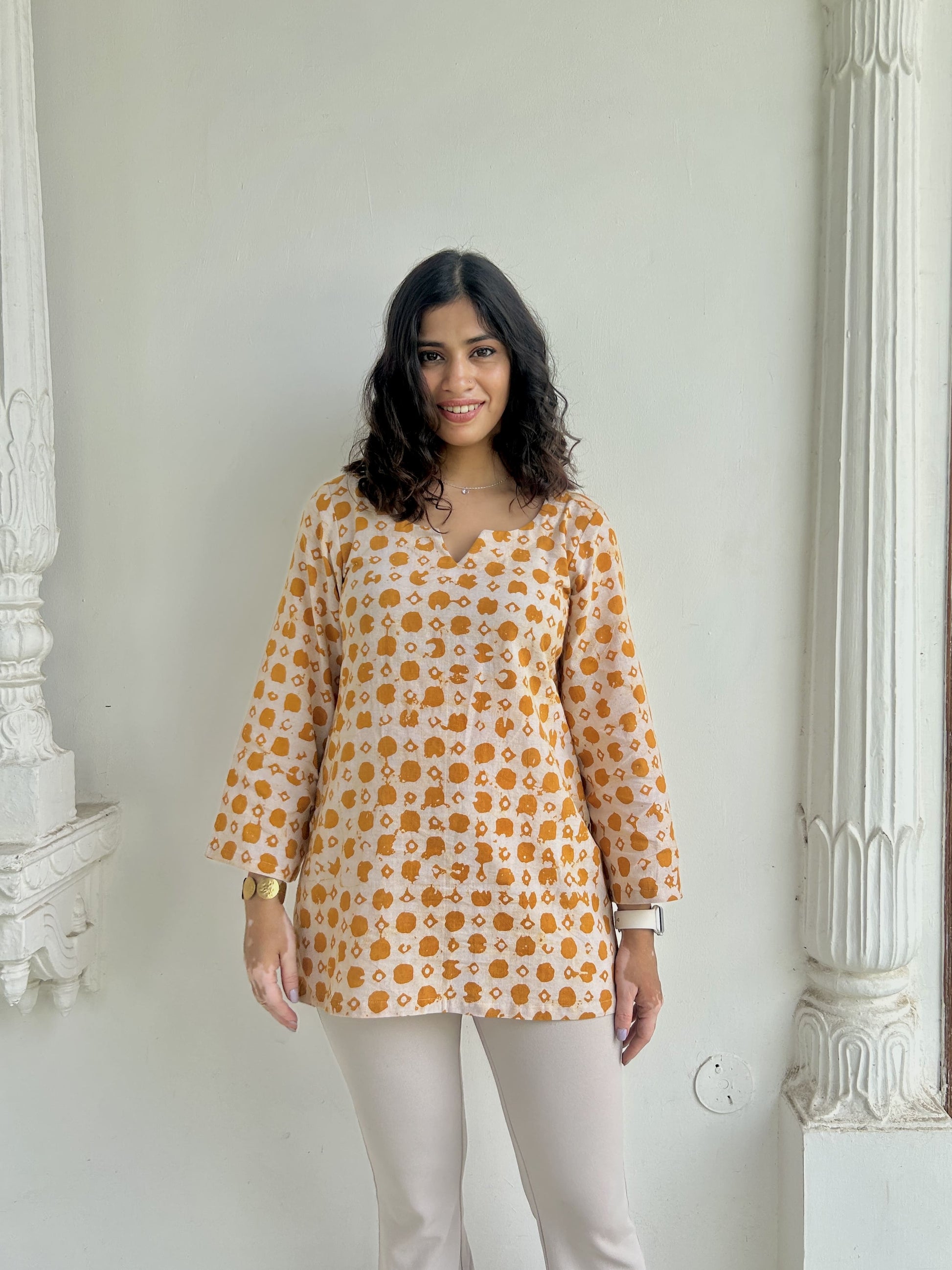 A minimal and breathable cotton short Kurti in mustard and beige tones. Designed with a subtle neckline, 3/4 sleeves, and side slits for everyday comfort. Easy to pair with denim, pants, or leggings.